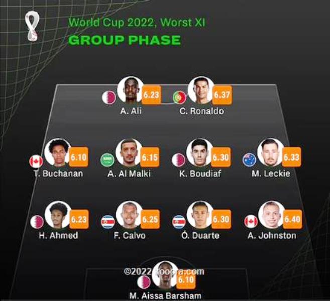 تصدر كريستيانو رونالدو، نجم المنتخب البرتغالي، التشكيلة الأسوأ لدور المجموعات في نهائيات كأس العالم قطر 2022. وسجل رونالدو، هدفا وحيدا في البطولة من ركلة جزاء ضد منتخب غانا بالجولة الأولى.