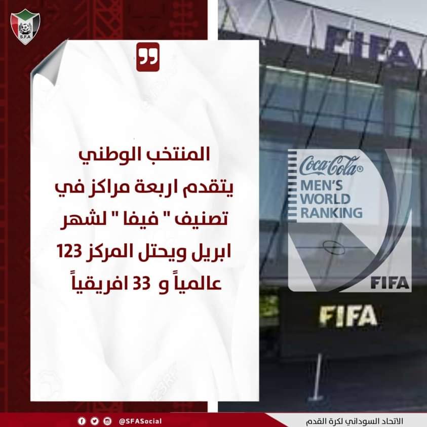 تقدم المنتخب السوداني في التصنيف الشهري للمنتخبات الصادر من مركز الاحصاء في الاتحاد الدولي لكرة القدم FIFA يوم الاربعاء 7 ابريل 2021، واحتل المنتخب المركز 123، بعد أن كان في المركز 127 خلال التصنيف الصادر في شهر فبراير الماضي. وخاض المنتخب مباراتين بين فبراير وابريل في تصفيات امم افريقيا2021، وفاز فيهما على ساوتومي وجنوب افريقيا بنتيجة "2-0″، وتأهل إلى نهائيات امم افريقيا الكاميرون. وجاء المنتخب خلال التصنيف في المركز 33 افريقياً. ويخوض المنتخب الوطني مباراته الدولية المقبلة في تصفيات كاس العالم2022، امام المغرب احد ايام "5،6،7،8 يونيو". وكانت لجنة المنتخبات الوطنية برئاسة الدكتور حسن برقو قد اجازت خطة الجهاز الفني للمنتخب بقيادة هوبير فيلود والمدرب العام خالد بخيت، للتحضير لتصفيات كاس العالم، والتي تحتوي على معسكر قصير في الخرطوم بين 16 الى 20 مايو 2021، قبل ان يخوض المنتخب مباراة ودية دولية بين 31 مايو الى 4 يونيو.